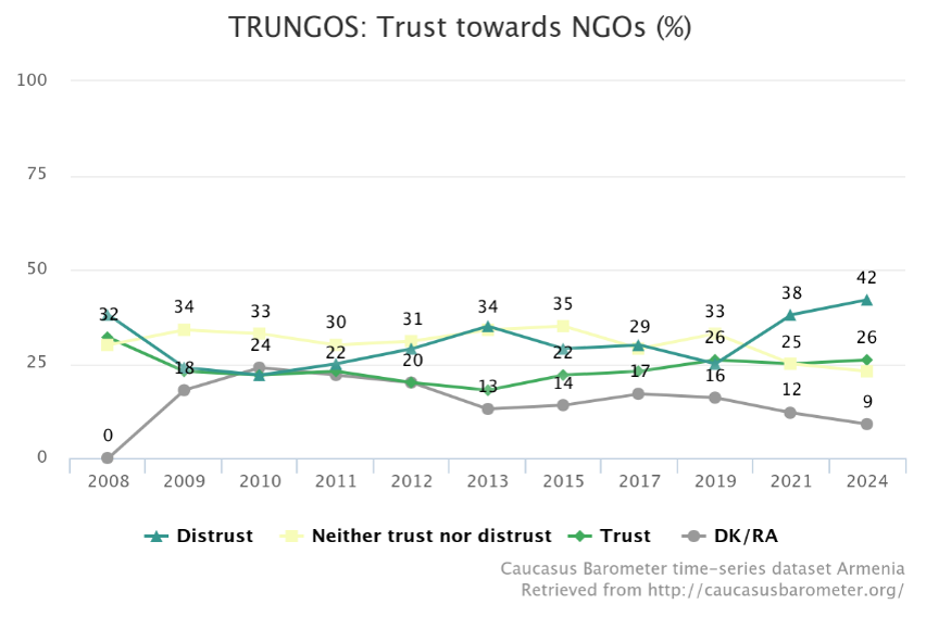 Public trust is the other critical pillar of civil society infrastructure, and here Armenia faces a troubling trend. Trust in NGOs and media has been declining, undermining the legitimacy of the civic sector. According to the Caucasus Barometer, conducted by CRRC-Armenia since 2008, public trust in NGOs has had an average of 23.6%.[32] Alarmingly, distrust toward NGOs rose to an all-time high of 42% in 2024. The media fares no better: while distrust averaged 31.7% between 2008 and 2019, it surged to 69% in 2021, and although it declined slightly by 2024, distrust remains high at 49%.[33] These trends suggest not only increasing scepticism toward key democratic actors, but a broader crisis of civic legitimacy.